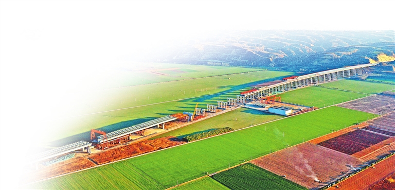 ??12月16日,孟州市境內(nèi),良田沃野間,沁伊高速黃河特大橋正在提速建設(shè)。中原大地一片生機(jī)。 白水平 攝