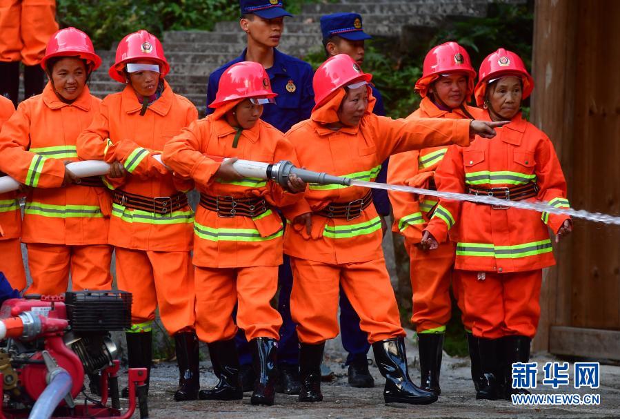 烏英苗寨女子志愿消防隊隊員梁足英(右三)和隊友們在融水縣消防救援大隊消防隊員的指導(dǎo)下進(jìn)行消防演練(11月19日攝)。新華社記者 黃孝邦 攝