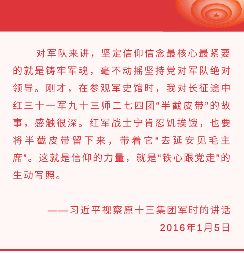 201615日,習(xí)主席視察原13集團軍,當(dāng)聽到半截皮帶的故事時,習(xí)主席深有感觸地說:這就是信仰的力量,就是鐵心跟黨走的生動寫照。