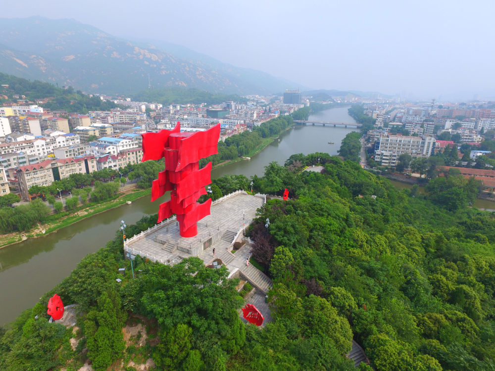河南省信陽市新縣鄂豫皖蘇區(qū)首府革命博物館附近的英雄山八面紅旗雕塑(201784日攝)。新華社記者 馮大鵬 攝