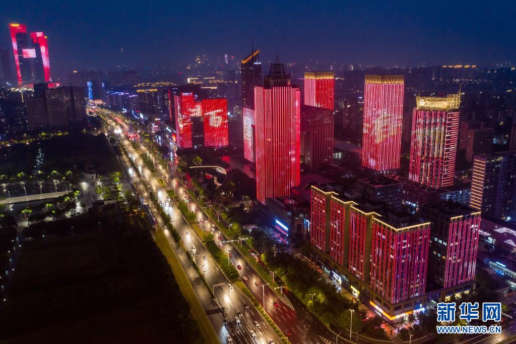 這是625日在南京市河西新城中軸線拍攝的慶祝建黨百年主題燈光秀(無(wú)人機(jī)照片)。新華社記者 李博 攝
