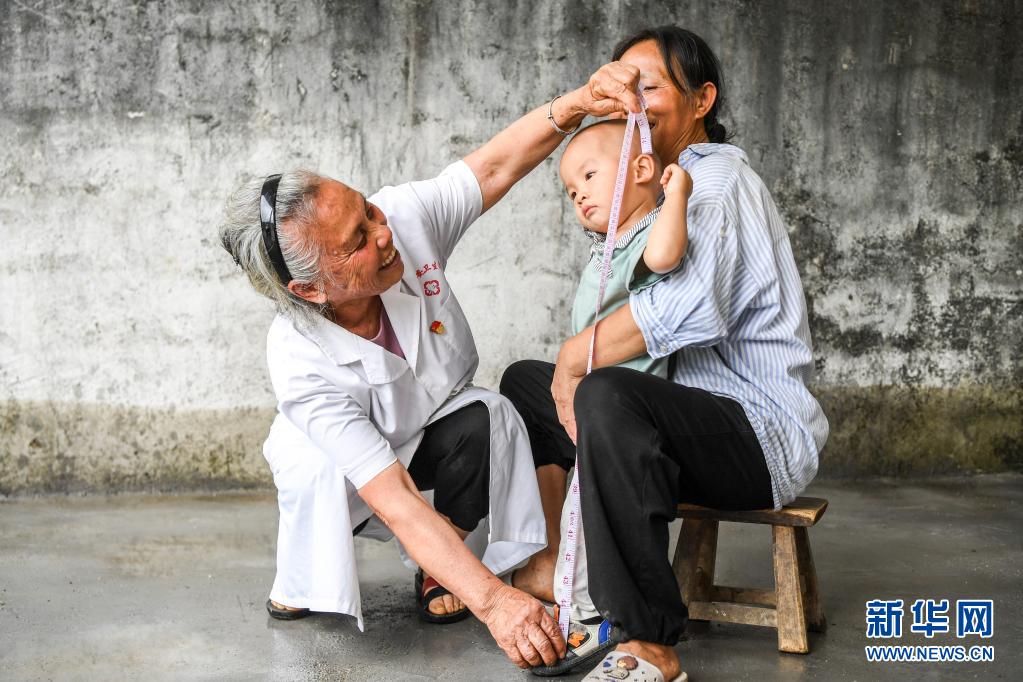 廣西賀州市鐘山縣兩安瑤族鄉(xiāng)竹梅村的鄉(xiāng)村醫(yī)生王秋姣(左)上門體檢時(shí)給小朋友測量身高(5月11日攝)。新華社記者 曹祎銘 攝