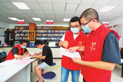 ?? 7月29日,鄭州市未來路街道金色港灣社區(qū),鄭州市大數(shù)據(jù)管理局工作人員與社區(qū)志愿者在統(tǒng)計居民受損情況。 本報記者 聶冬晗 攝