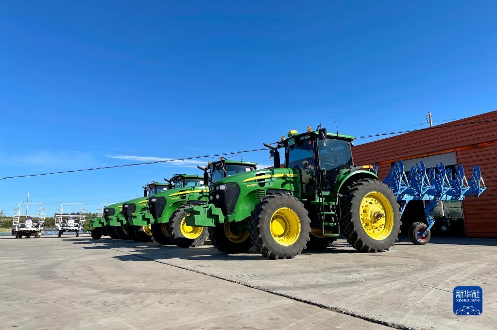 在黑龍江省北安市革命現(xiàn)代農(nóng)機(jī)專業(yè)合作社,現(xiàn)代化農(nóng)機(jī)整齊排放(9月18日攝)。新華社記者 楊思琪 攝
