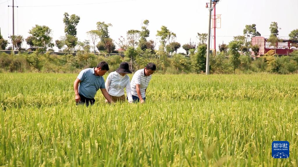在汨羅鎮(zhèn)江景村,汨羅市農(nóng)業(yè)農(nóng)村局的兩名技術(shù)人員正查看“泰優(yōu)390”的結(jié)實(shí)率。根據(jù)各家情況,他們向村民們科普如何更好地做到綠色病蟲害防控、調(diào)整農(nóng)藥和化肥用量。