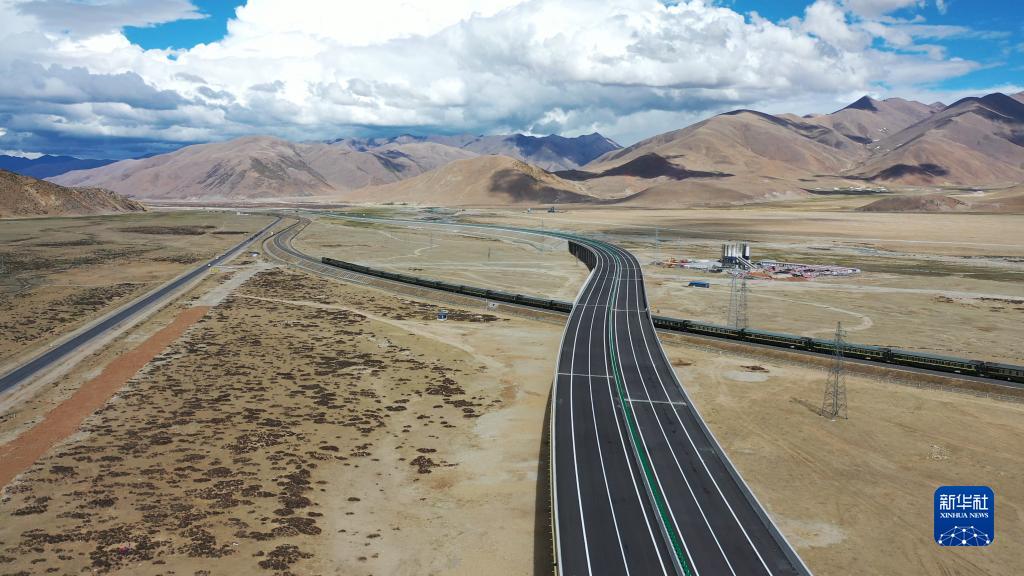 在京藏高速那曲至羊八井段,火車經(jīng)過(guò)跨青藏鐵路特大橋(5月30日攝,無(wú)人機(jī)照片)。新華社發(fā)(胡雪峰 攝)