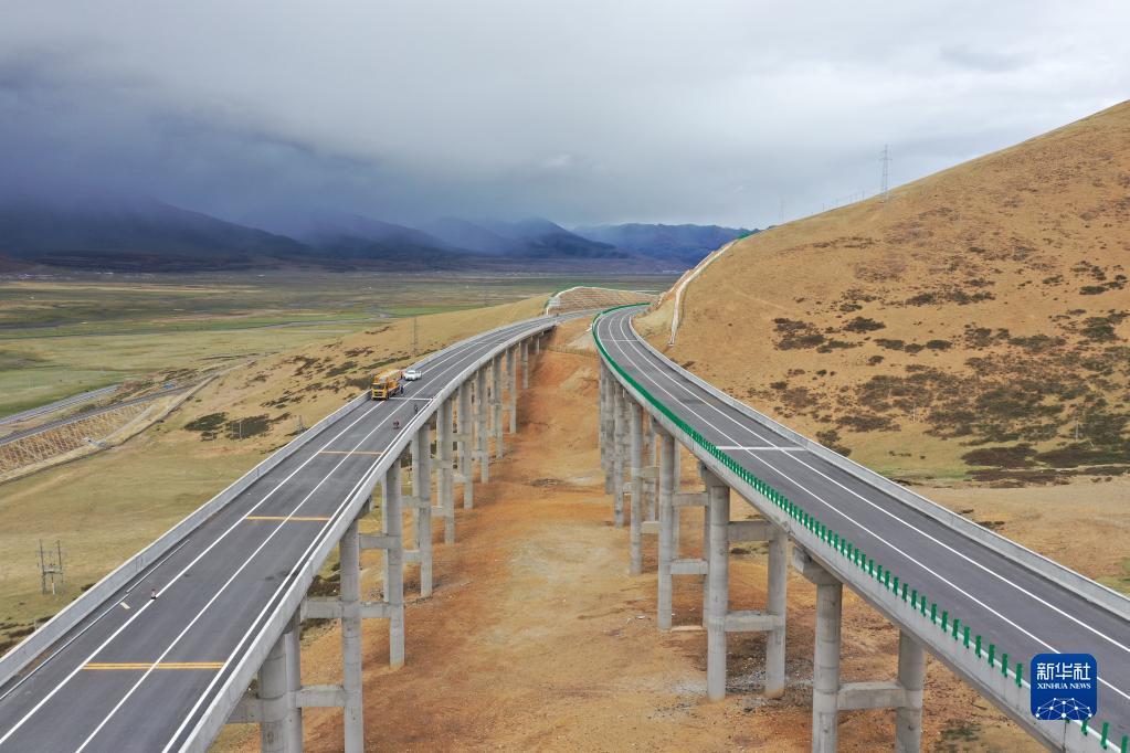 西藏拉薩市當(dāng)雄縣境內(nèi)由中鐵城投承建的京藏高速那曲至羊八井段堆巴果大橋(5月29日攝,無(wú)人機(jī)照片)。新華社發(fā)(胡雪峰 攝)