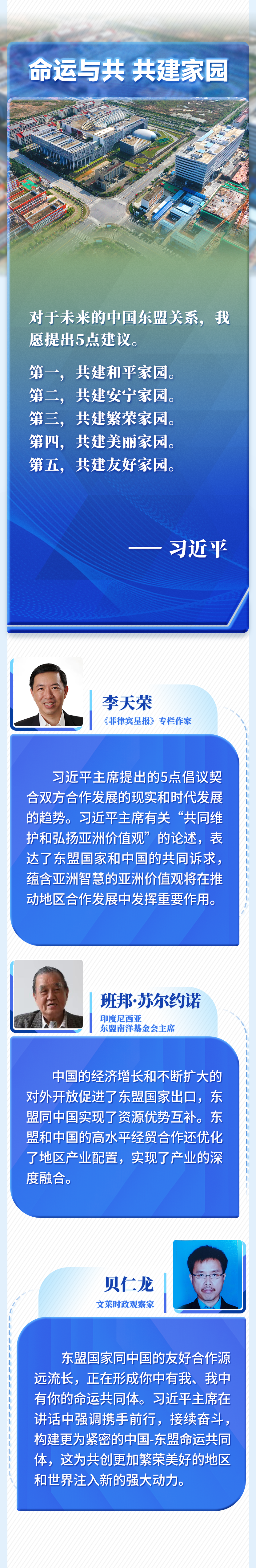 中國古人說:“謀度于義者必得,事因于民者必成?!弊屛覀儼讶嗣駥?duì)美好生活的向往放在心頭,把維護(hù)和平、促進(jìn)發(fā)展的時(shí)代使命扛在肩上,攜手前行,接續(xù)奮斗,構(gòu)建更為緊密的中國-東盟命運(yùn)共同體,共創(chuàng)更加繁榮美好的地區(qū)和世界!