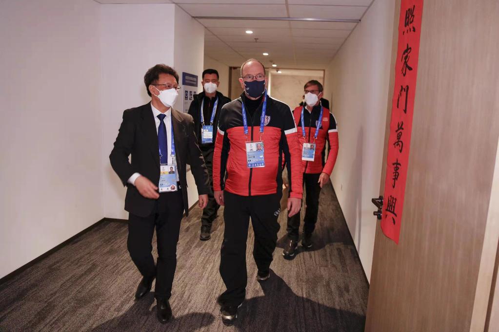阿爾貝二世親王(前右)來到新華社冬奧前方報道中心