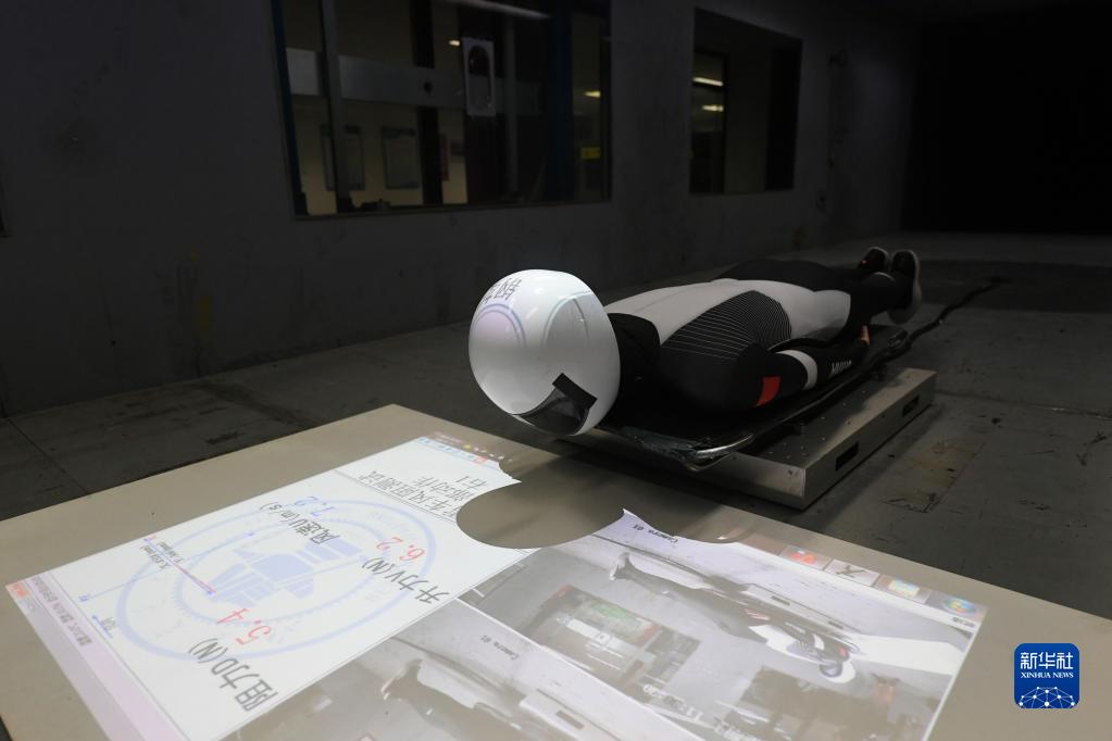 在北京交通大學風洞實驗室,風洞輔助訓練系統(tǒng)顯示的信息將運動速度、運動風阻力、運動姿態(tài)及測試指令實時反饋給測試人員(2021年7月16日攝)。新華社記者 任超 攝