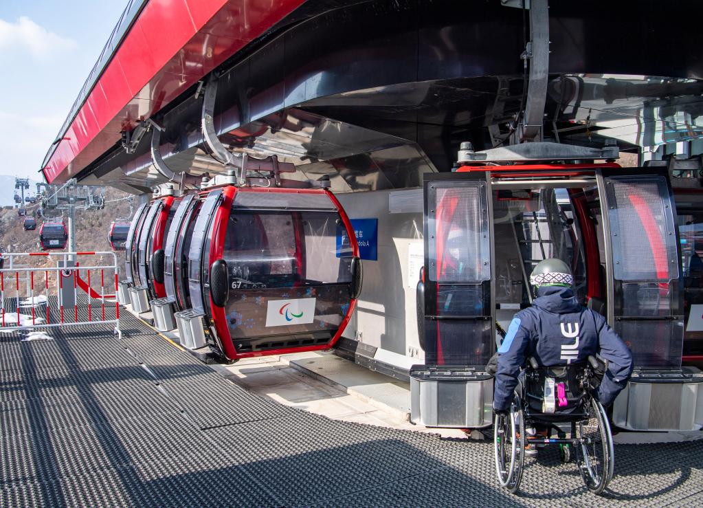 國家游泳中心看臺(tái)無障礙座席及衛(wèi)生間均比原來增加一倍;國家高山滑雪中心轎廂式纜車可供輪椅使用……