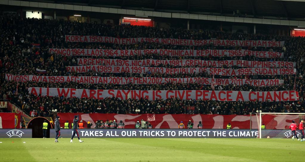 3月17日,在塞爾維亞首都貝爾格萊德舉行的一場(chǎng)足球比賽中,塞爾維亞觀眾拉起多條橫幅,細(xì)數(shù)美國、北約過去幾十年來轟炸或挑起戰(zhàn)爭(zhēng)的國家和地區(qū)名單,并高唱反戰(zhàn)歌曲,以此諷刺西方在“反戰(zhàn)”方面的雙重標(biāo)準(zhǔn)。(新華社發(fā),普雷德拉格·米洛薩夫列維奇攝)