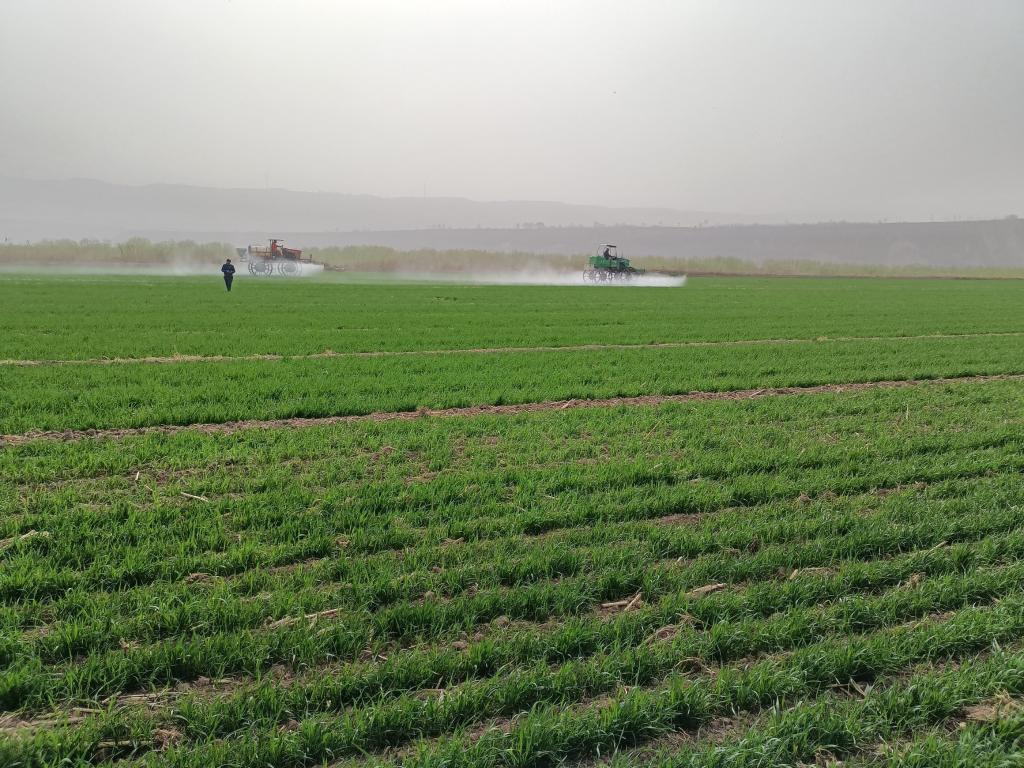 在胡天妮的麥田里,機(jī)器噴灑葉面肥和殺菌劑以促弱苗轉(zhuǎn)壯。受訪者供圖。
