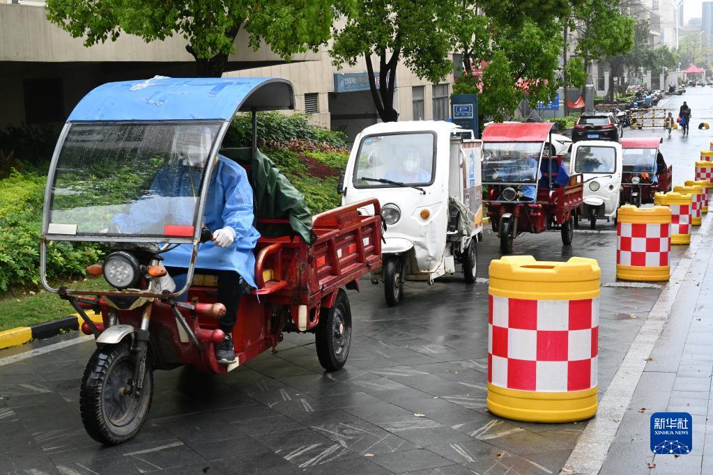 4月7日,在長(zhǎng)沙市雨花區(qū)東塘街道楓樹山社區(qū),志愿者在卸載生活物資。新華社記者 陳思汗 攝