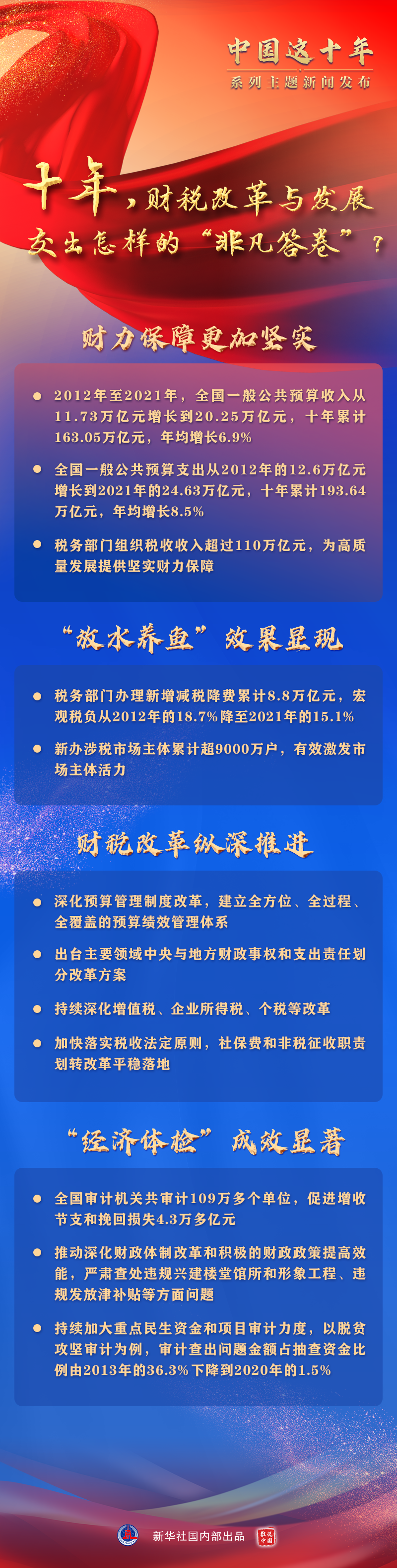 財稅體制改革縱深推進,財政宏觀調控不斷完善,精準實施減稅降費,充分發(fā)揮審計在黨和國家監(jiān)督體系中的重要作用……