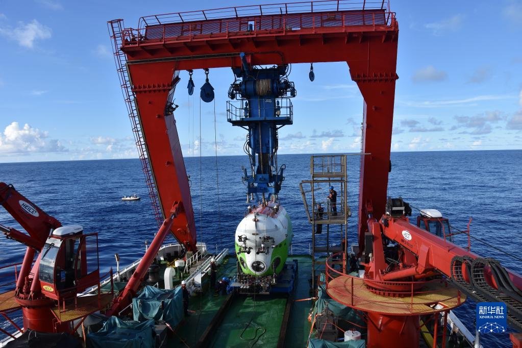 2021年8月18日,工作人員在西太平洋準(zhǔn)備從“探索一號(hào)”科考船甲板布放“奮斗者”號(hào)。新華社記者 陳凱姿 攝