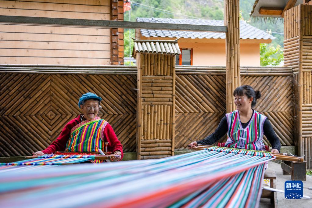 在云南省貢山獨龍族怒族自治縣獨龍江鄉(xiāng)迪政當村,獨龍族老人李文仕(左)和女兒在編織獨龍?zhí)海?月10日攝)。新華社記者 曹夢瑤 攝