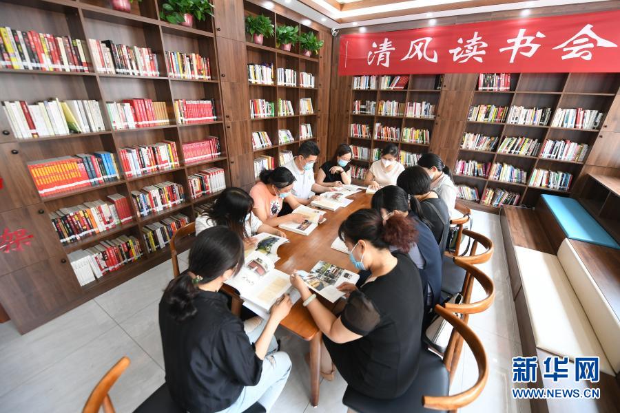 2020年6月23日,河北省棗強縣紀委監(jiān)委組織部分單位黨員干部,在縣文化廣電和旅游局舉行“清風讀書會”。新華社記者 李曉果 攝