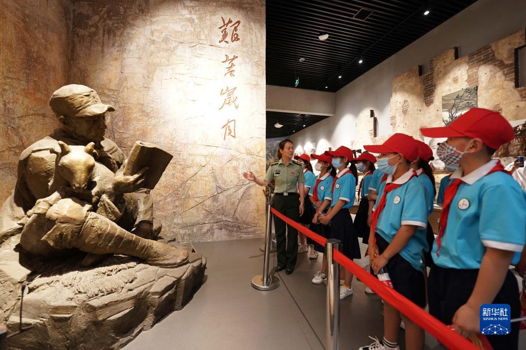 2021年5月30日,在位于河北省邢臺市信都區(qū)漿水鎮(zhèn)的中國人民抗日軍政大學陳列館,工作人員向小學生們講述抗大歷史。新華社記者 牟宇 攝
