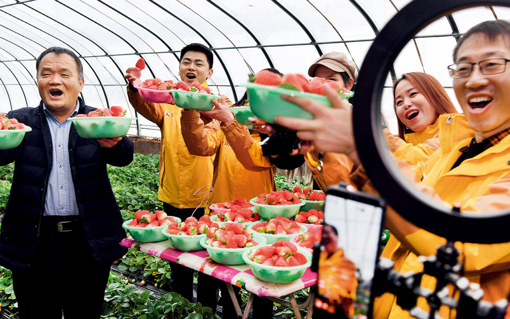 ▲ 一家電商平臺(tái)工作人員在陜西省合陽縣金峪鎮(zhèn)溝北現(xiàn)代農(nóng)業(yè)科技示范區(qū)直播推廣草莓(2020年1月10日攝) 陶明攝