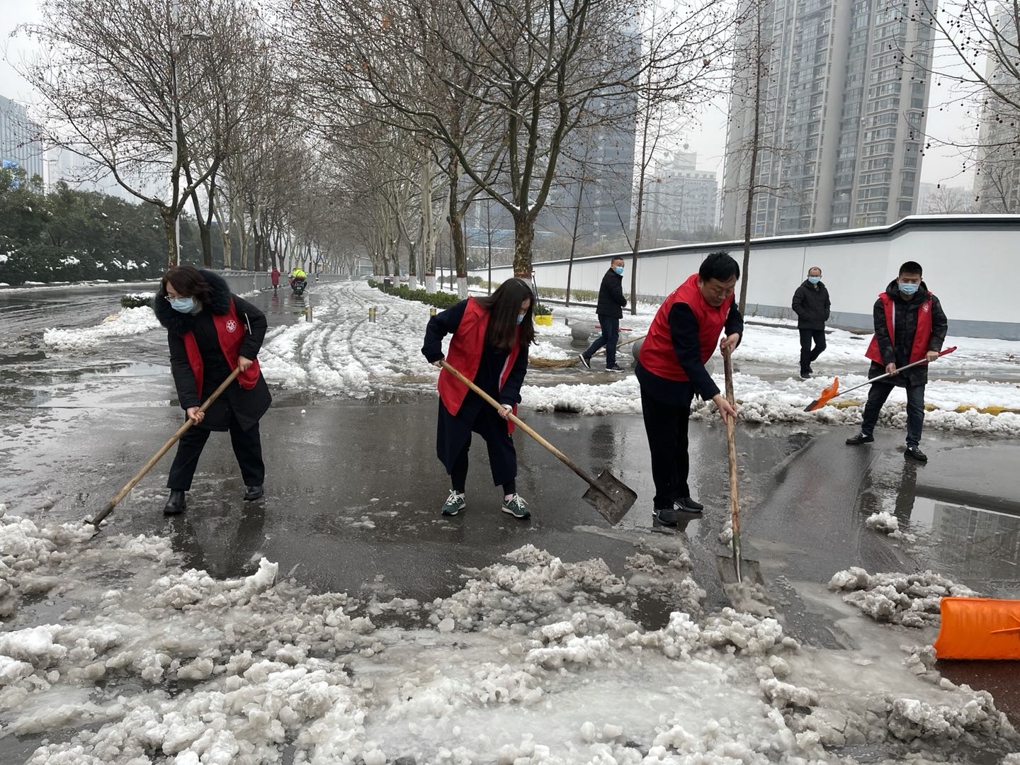大家不畏嚴寒,不畏濕滑,齊心協(xié)力,配合默契,鏟的鏟、推的推,每個人分工明確、團結(jié)合作,干得熱火朝天、不亦樂乎,忙碌的身影構(gòu)成了街邊一道亮麗的風(fēng)景線。