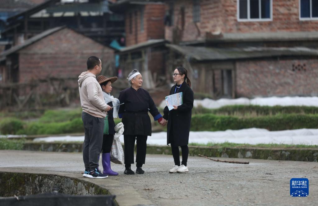 在廣西柳州市三江侗族自治縣良口鄉(xiāng)南寨村,紀檢監(jiān)察干部(右一、左一)在了解惠農(nóng)政策落實情況(2022年3月24日攝)。新華社記者 黃孝邦 攝