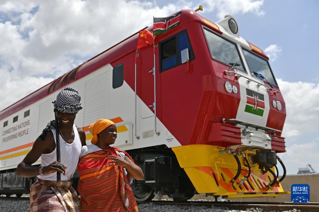 在肯尼亞蒙巴薩,當(dāng)?shù)孛癖娫谥袊兄频拿蓛?nèi)鐵路首批內(nèi)燃機(jī)車旁載歌載舞(2017年1月11日攝)。新華社記者 孫瑞博 攝