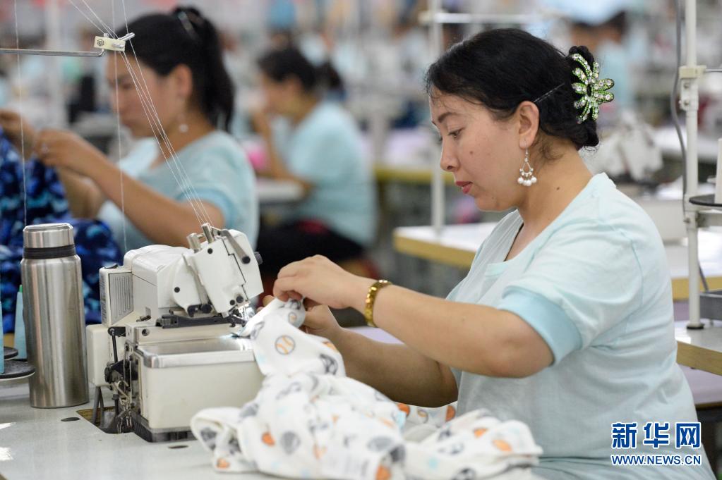 在新疆和田地區(qū)和田縣布扎克鄉(xiāng)思源扶貧產(chǎn)業(yè)園,工人在制作服裝(2019831日攝)。新華社記者 丁磊 攝
