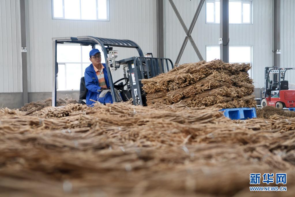 在甘肅省隴南市宕昌縣哈達(dá)鋪琦昆現(xiàn)代中藥材倉儲(chǔ)物流基地,工作人員使用叉車搬運(yùn)中藥材(2020918日攝)。新華社記者 范培珅 攝
