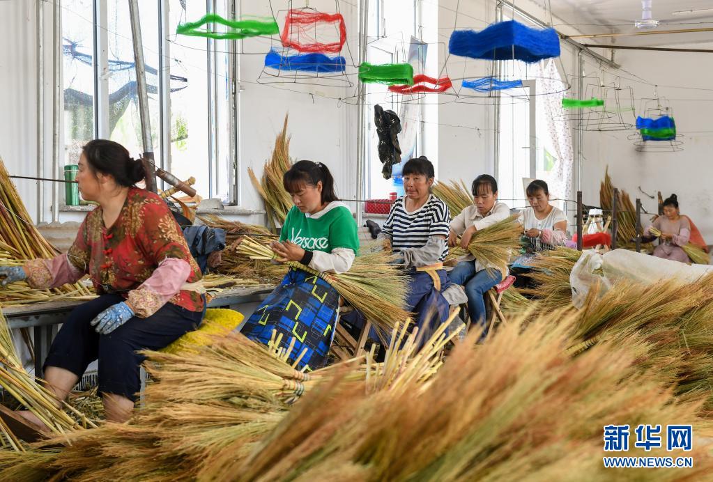 婦女在內(nèi)蒙古巴林左旗林東鎮(zhèn)扶貧車間內(nèi)制作笤帚(201985日攝)。新華社記者 彭源 攝
