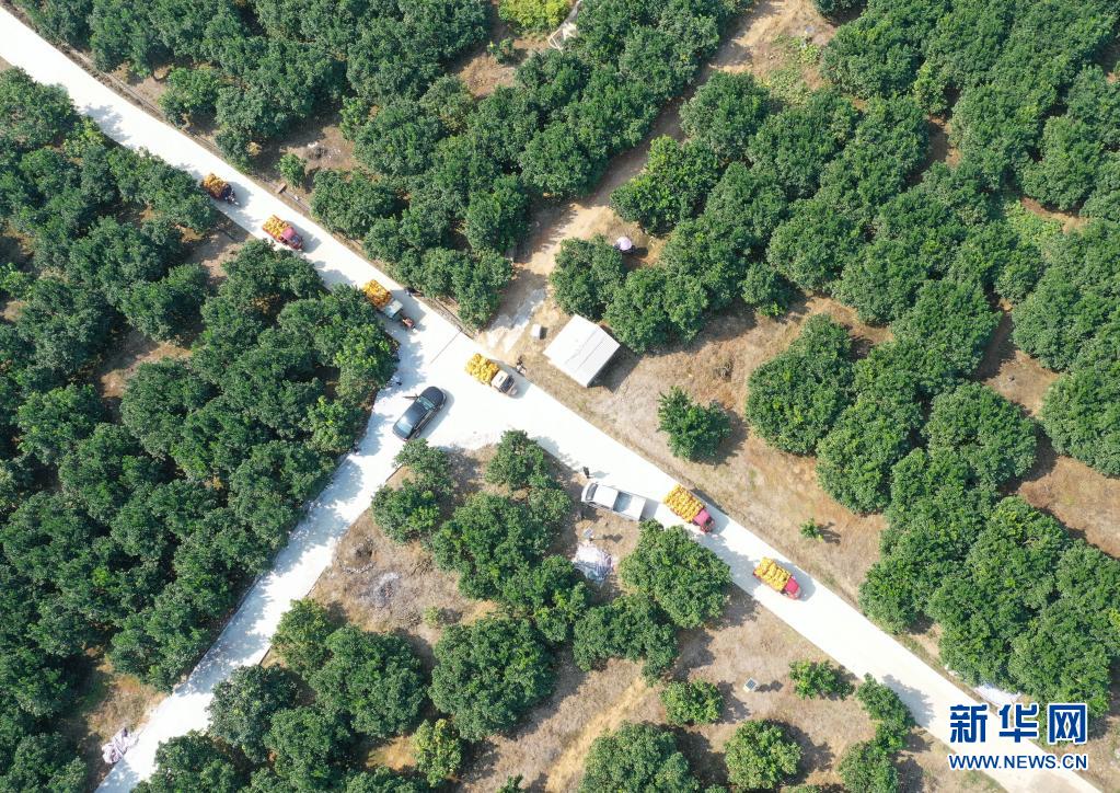 在廣西羅城仫佬族自治縣金玉柚生態(tài)產(chǎn)業(yè)扶貧示范區(qū),裝載柚子的車輛在柚子園內(nèi)行駛(2019115日攝,無人機(jī)照片)。新華社記者 陸波岸 攝