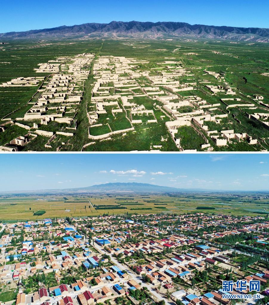 這是一張拼版照片,上圖為:經(jīng)過多年的生態(tài)修復(fù),寧夏吳忠市紅寺堡區(qū)新莊集鄉(xiāng)的移民舊址已逐漸被綠色覆蓋;下圖為:戈壁荒灘上建起的紅寺堡移民新村(201898日攝,無人機(jī)照片)。新華社記者 王鵬 攝