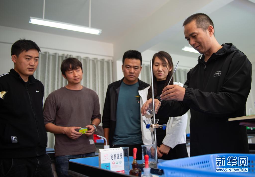 北京市援青支教教師、來自通州區(qū)陸辛莊學(xué)校的化學(xué)教師祁生貴(右一)在青海省玉樹州第四民族高級(jí)中學(xué)指導(dǎo)學(xué)校教師進(jìn)行實(shí)驗(yàn)教學(xué)(2020812日攝)。新華社記者 陳鐘昊 攝