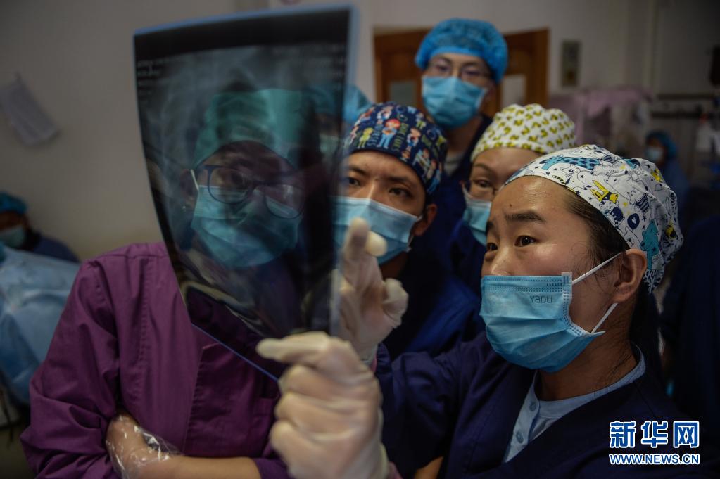 在西藏拉薩市人民醫(yī)院內(nèi),首都兒科研究所的援藏醫(yī)生韓同英(右一)進(jìn)行教學(xué)查房時(shí),與當(dāng)?shù)蒯t(yī)生們一起研究入院新生兒胸片(202083日攝)。新華社記者 彭子洋 攝