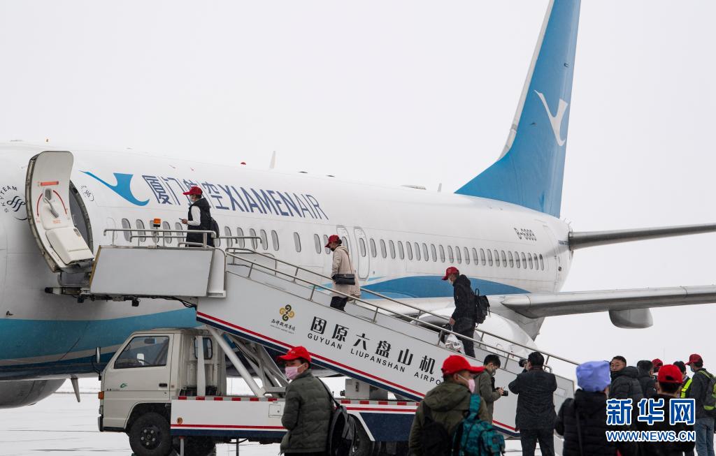 在寧夏固原六盤山機(jī)場(chǎng),固原市原州區(qū)、西吉縣的務(wù)工人員乘包機(jī)前往福建(2020227日攝)。新華社記者 馮開華 攝