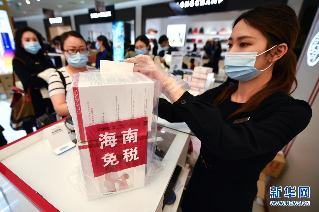 1月7日,??谌赵聫V場(chǎng)免稅店的工作人員在打包免稅品。新華社記者 郭程 攝
