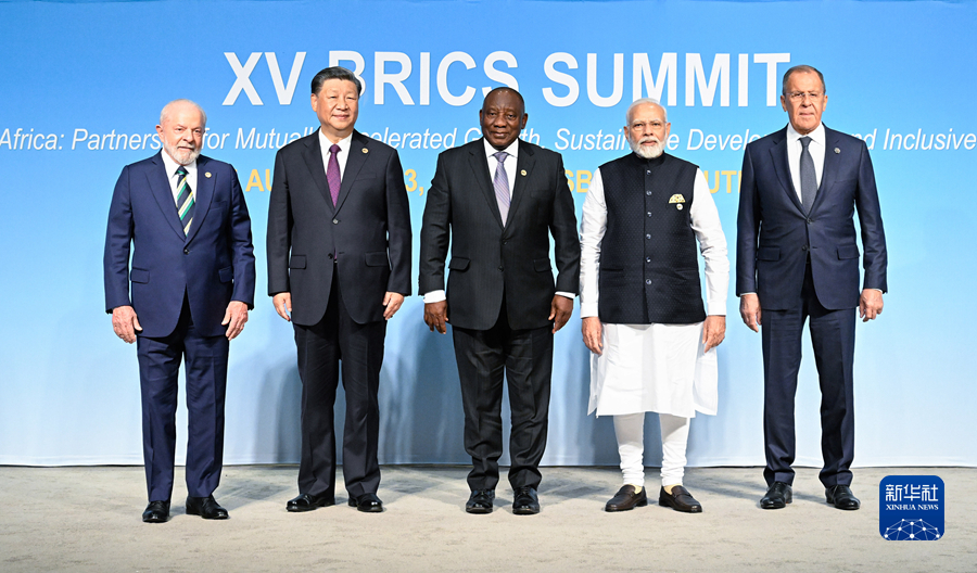 當(dāng)?shù)貢r(shí)間8月23日上午,金磚國家領(lǐng)導(dǎo)人第十五次會(huì)晤在約翰內(nèi)斯堡杉藤會(huì)議中心舉行。南非總統(tǒng)拉馬福薩主持會(huì)晤。中國國家主席習(xí)近平、巴西總統(tǒng)盧拉、印度總理莫迪和俄羅斯總統(tǒng)普京(線上)出席。習(xí)近平發(fā)表題為《團(tuán)結(jié)協(xié)作謀發(fā)展 勇于擔(dān)當(dāng)促和平》的重要講話。新華社記者 李學(xué)仁 攝