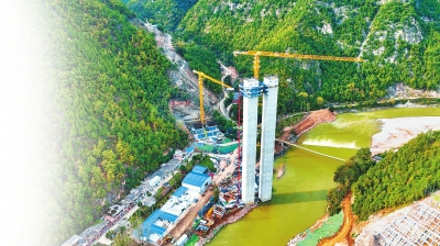 10月9日,在位于盧氏縣徐家灣鄉(xiāng)鳳凰灣村的盧氏至洛南(豫陜省界)高速公路良木村洛河特大橋施工現(xiàn)場,一根根百米高墩拔地而起,在山巒間筑起了一道結(jié)實宏偉的“墩林”。