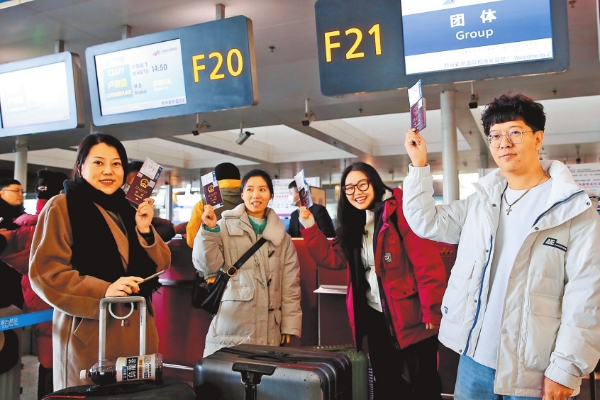 ??12月21日,搭乘首趟航班的乘客合影留念。