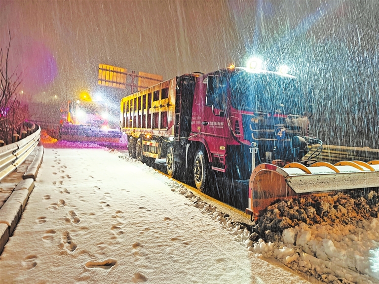 1月31日下午,我省迎來今年首場大范圍雨雪。河南交投集團(tuán)全力清理積雪,保障高速大通道安全暢通,守護(hù)春運(yùn)期間群眾的美好歸鄉(xiāng)路。圖為工作人員駕駛除雪車行駛在連霍高速鄭州段。陳曉娟 攝