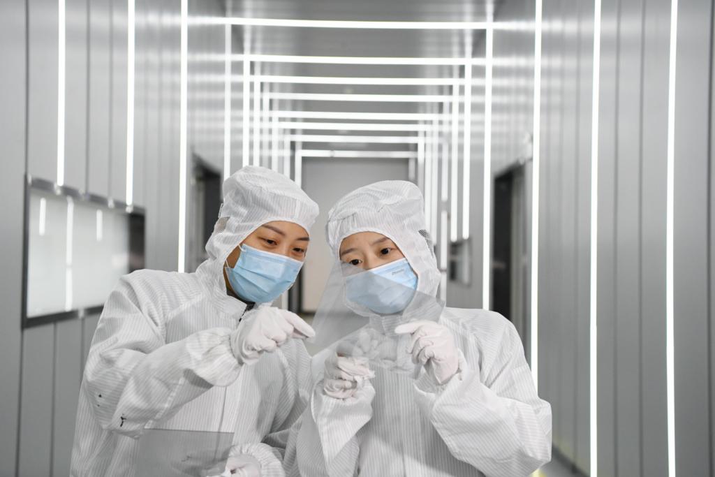 ??在東超科技工廠,技術(shù)人員檢查負折射平板透鏡原材料的品質(zhì)。
