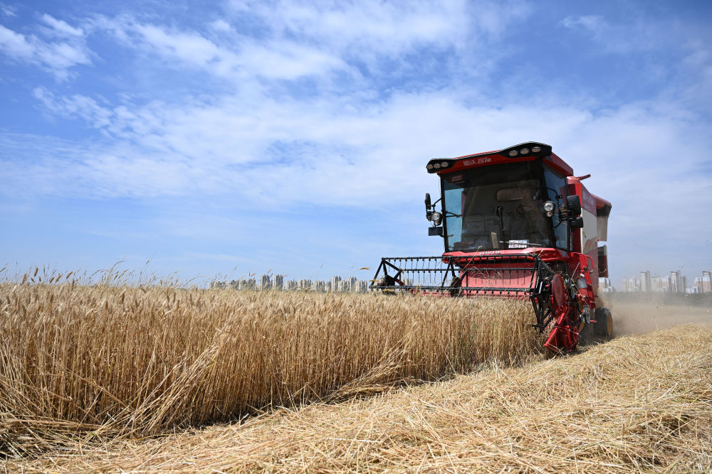 ??2024年5月29日,在安徽省蚌埠市五河縣朱頂鎮(zhèn)淮河岸邊,農(nóng)機手駕駛收割機收割小麥。新華社記者 黃博涵 攝