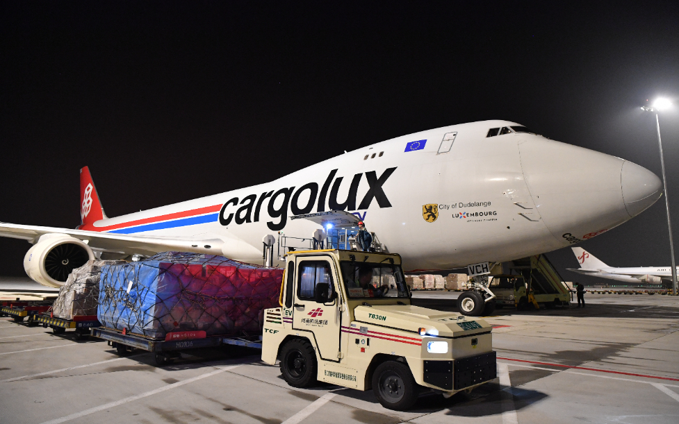 ??在鄭州新鄭國際機場,工作人員駕駛新能源拖車為一架盧森堡貨航貨機卸貨(2023年8月1日攝)。新華社記者 李嘉南 攝
