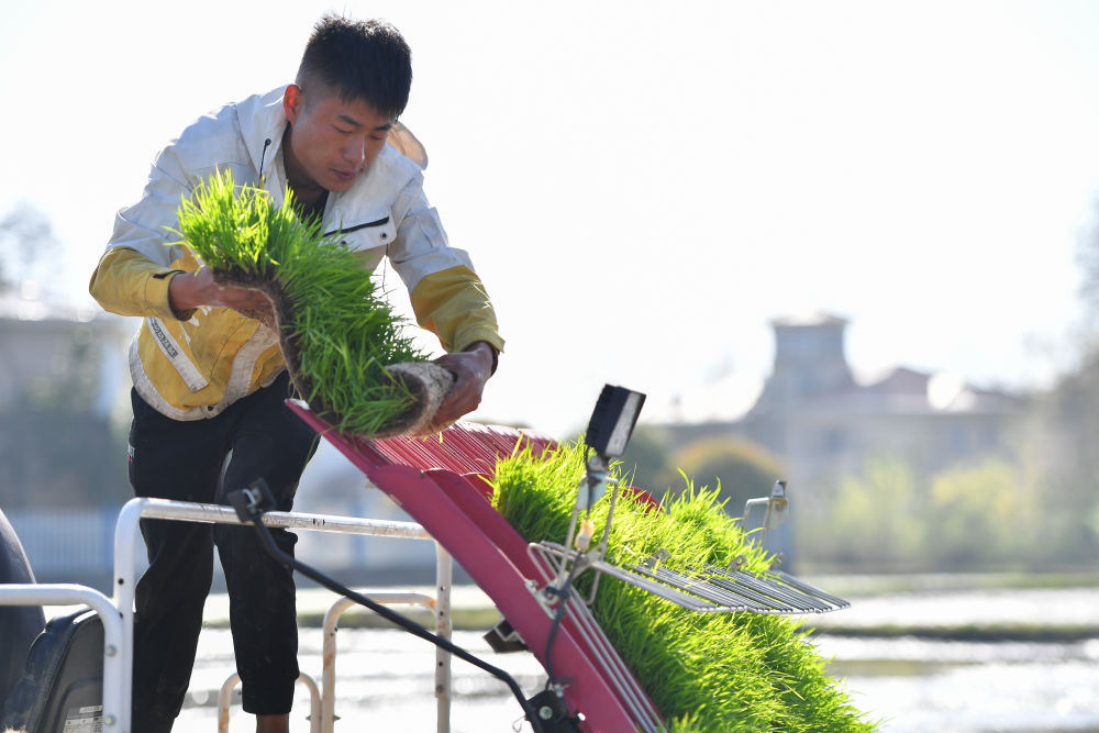 2024年3月29日,在湖南省長沙市望城區(qū)高塘嶺街道沱市村,農(nóng)戶將秧苗放到插秧機上。新華社記者 陳澤國 攝