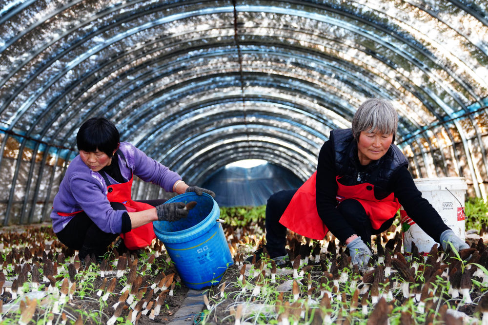 2024年3月20日,農(nóng)民在山東省濟寧市微山縣驩城鎮(zhèn)袁堂華能光伏電站農(nóng)光互補項目的大棚里采摘羊肚菌。該項目是采煤塌陷區(qū)綜合整治項目,集農(nóng)光互補、漁光互補于一體。新華社記者 郭緒雷 攝