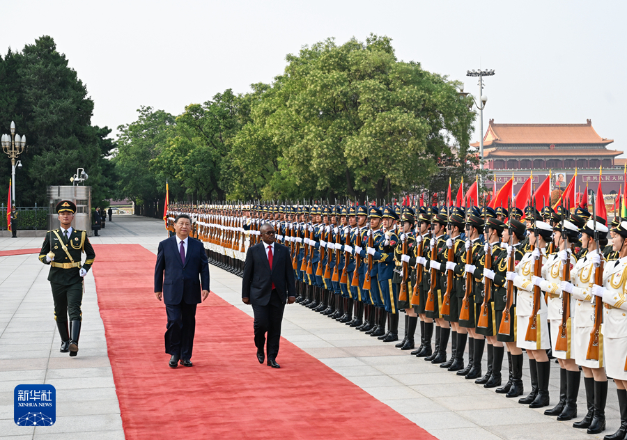 ??恩巴洛抵達時,禮兵列隊致敬。兩國元首登上檢閱臺,軍樂團奏中國和幾內(nèi)亞比紹兩國國歌,天安門廣場鳴放21響禮炮。恩巴洛在習(xí)近平陪同下檢閱中國人民解放軍儀仗隊,并觀看分列式。