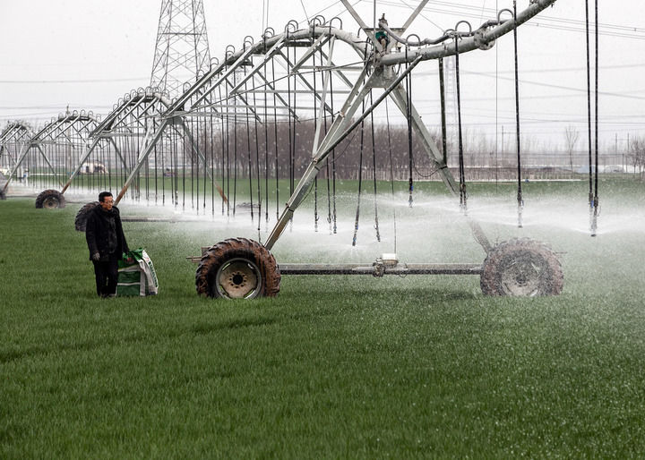 ??2024年3月18日,在河南省焦作市博愛縣孝敬鎮(zhèn)東原莊村瑞輝家庭農(nóng)場(chǎng),村民使用全自動(dòng)指針式噴灌機(jī)進(jìn)行澆灌作業(yè)。新華社發(fā)(程全攝)