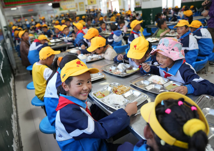 ??西藏林芝市工布江達縣娘蒲鄉(xiāng)中心小學學生在食堂用餐(2024年9月3日攝)。新華社記者 晉美多吉 攝